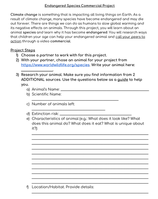 Students worked with a partner to research an endangered species and then write about their findings. Then students film and edit a commercial/P.S.A. to report their research and to call people to action by providing ways they can help the animal.